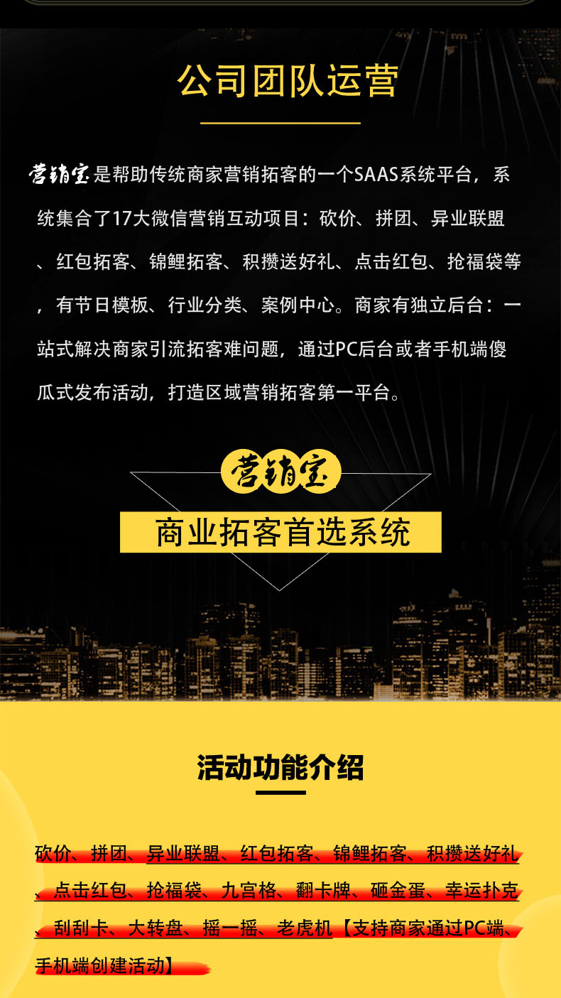 二、营销宝系统功能:支持实现市面上主流营销活动类型:异业联盟、红包拓客、助力砍价、经典拼团、阶梯拼团、锦鲤拓客、积攒送好礼、点击红包、抢福袋、九宫格、翻卡牌、砸金蛋、幸运扑克、刮刮卡、大转盘、摇一摇、老虎机、多项目线上报名、答题红包......